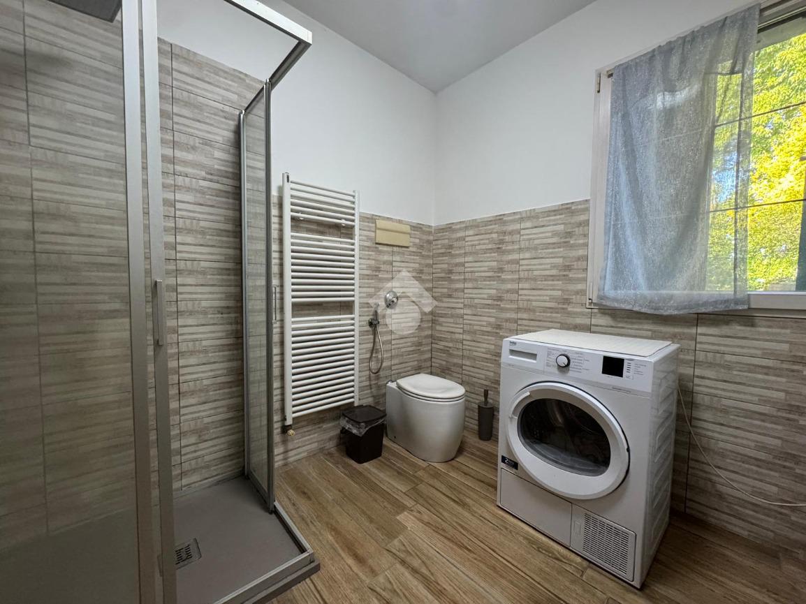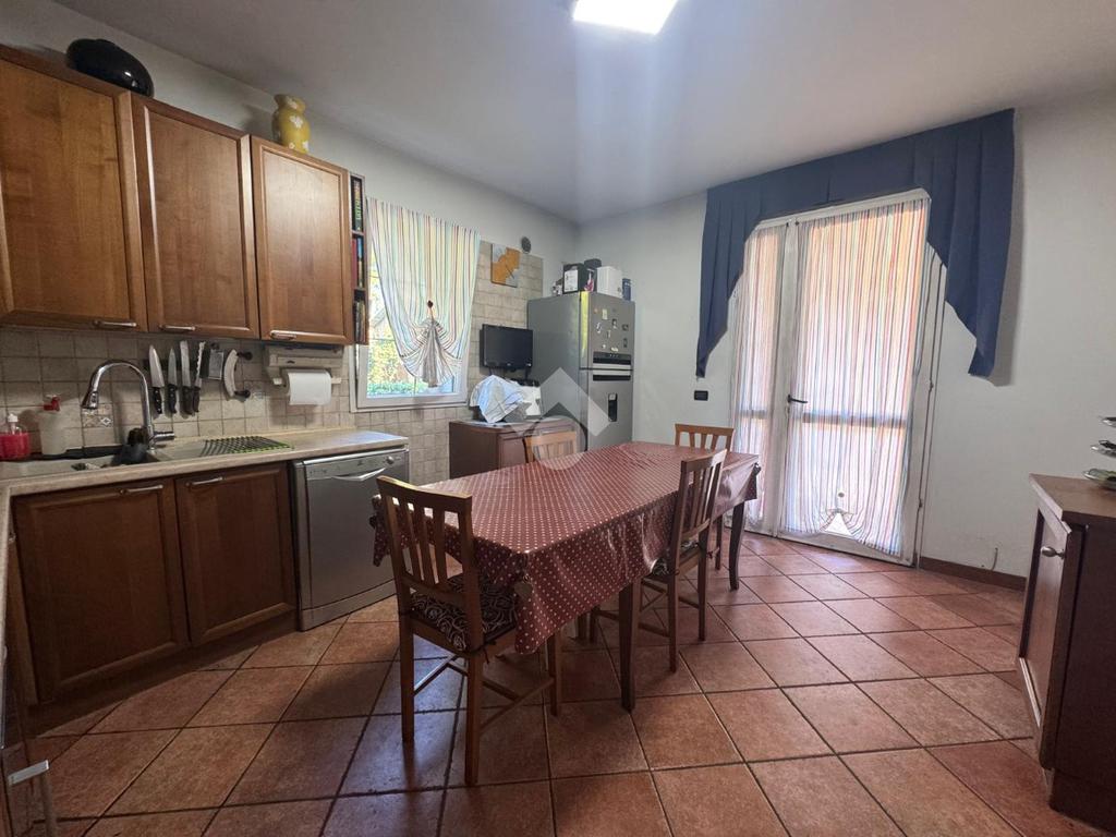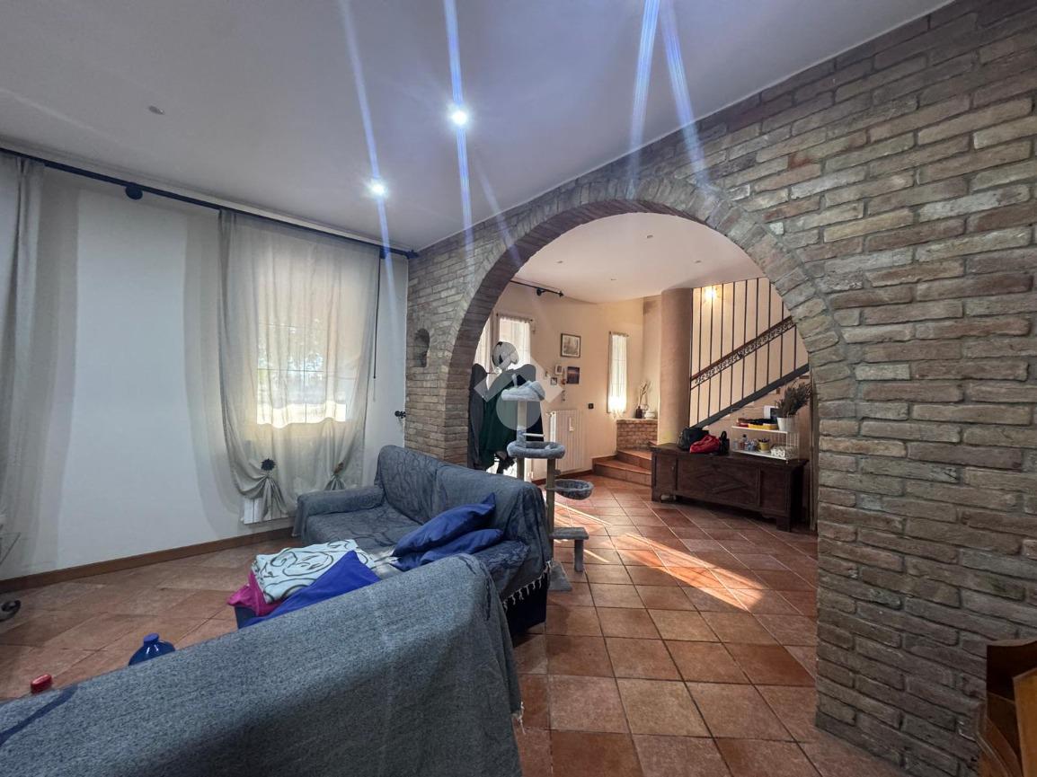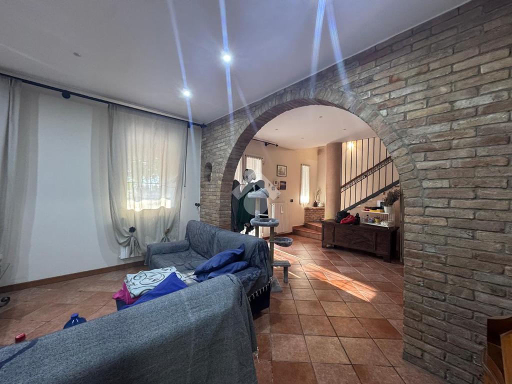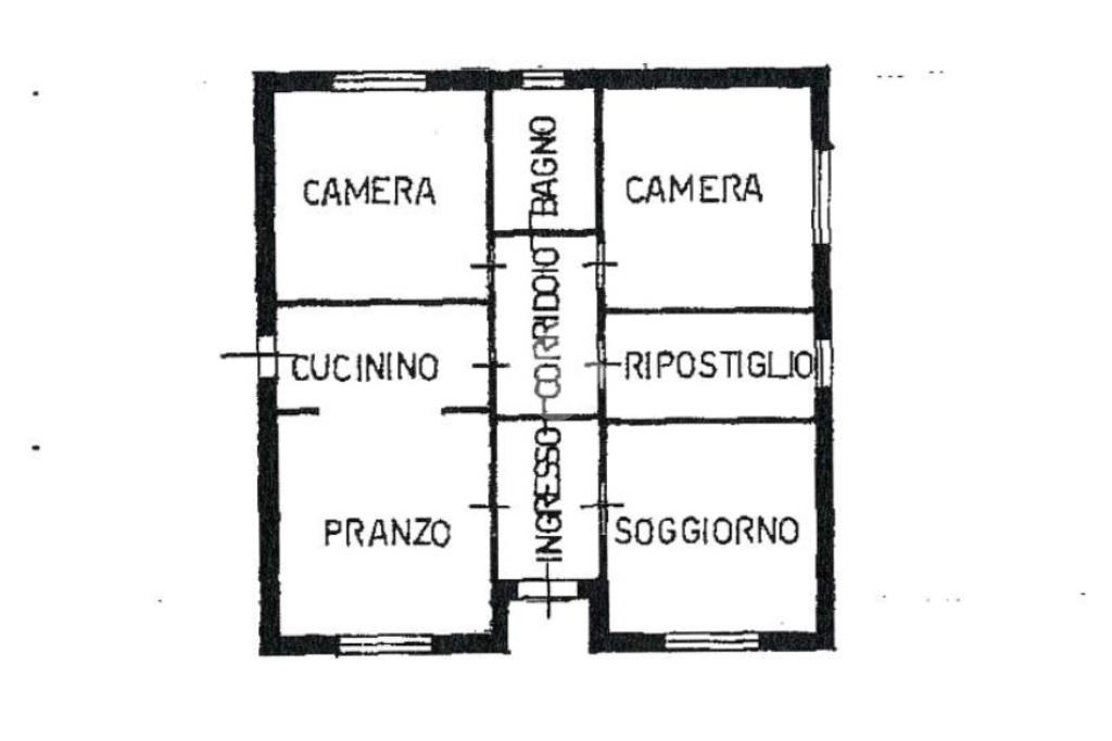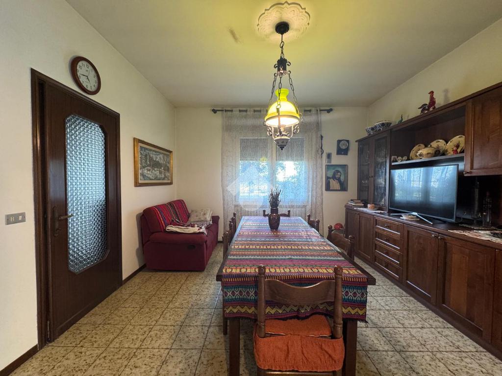 COMPOSIZIONE DELLA PROPRIETA'. La prima unità di 118 mq circa, sviluppata su un unico piano terra che si compone di ingresso, sala da pranzo separata con cucinotto con ulteriore ingresso esterno e soggiorno; nella zona notte tre camere: una singola e due matrimoniali ed il bagno finestrato con doccia. E' collegata con l'altra abitazione dalla tettoia di 36 mq usata con posto auto che si congiunge al porticato.